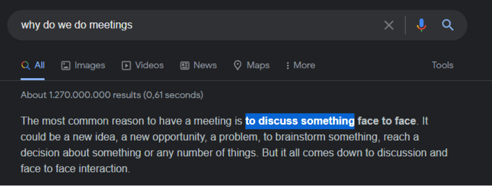 Let’s take a step back and try to understand why we do meetings in the first place. So I googled it.