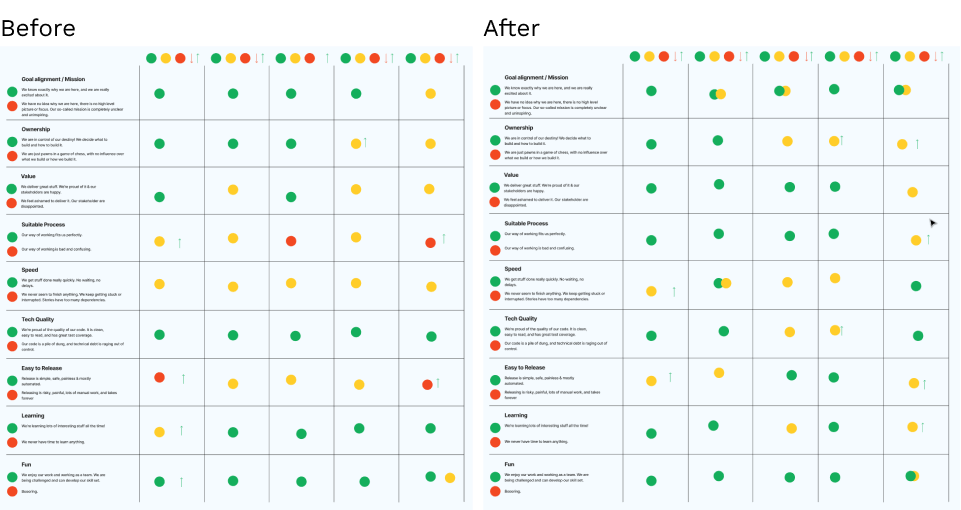 After each retrospective every participant is asked to rate different topics. Each topic has a defined range for good (green dot) and bad (red dot). An arrow also indicates in detail the direction of the trend, whether it is getting better or worse.